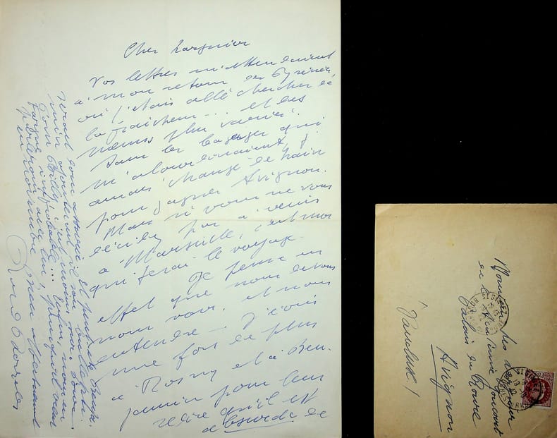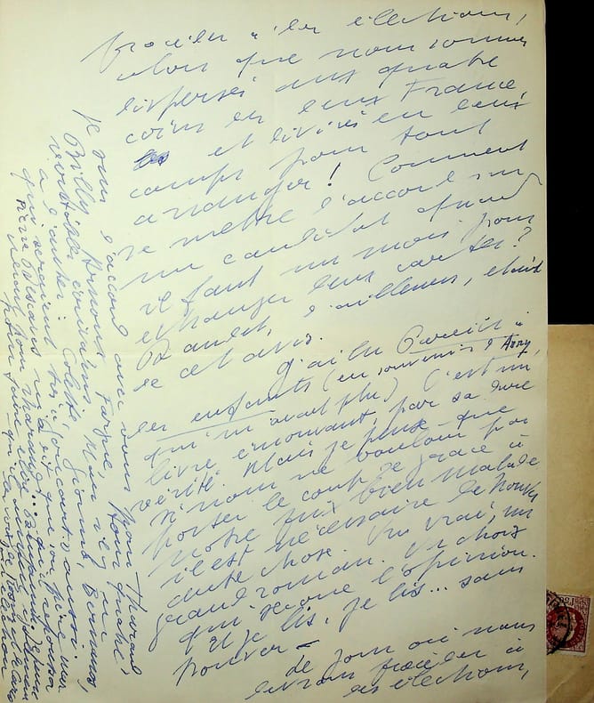 Roland Dorgelès (1885-1973), écrivain, membre de l'Académie Goncourt. L.A.S. + enveloppe, [19 octobre 1942?], 2p in-4. A l'écrivain membre de l'Académie Goncourt Léo Larguier (1878-1950). « Cher Larguier, Vos lettres m'attendaient à mon retour des Pyrénées, où j'étais allé chercher de la fraicheur. et les menus plus variés. Sans les bagages qui m'alourdissaient, j'aurais changé de train pour gagner Avignon. Mais si vous ne vous décidez pas à venir à Marseille, c'est moi qui ferai le voyage. Je pense en effet que nous devons nous voir, et nous entendre. J'écris une fois de plus à Rosny et à Benjamin pour leur redire qu'il est absurde de procéder à une élection alors que nous sommes dispersés aux quatre coins des deux France et divisés en deux camps pour tout arranger ! Comment se mettre d'accord sur un candidat quand il faut un mois pour échanger deux cartes ? Daudet, d'ailleurs, était de cet avis. J'ai lu Pareils à des enfants (en souvenir d'Anny qui m'avait plu). C'est un livre émouvant, par sa dure vérité. Mais je pense que si nous ne voulons pas porter le coup de grâce à notre prix bien malade, il est nécessaire de trouver autre chose. Un vrai, un grand roman. Un choix qui secoue l'opinion. Et je lis, je lis. sans trouver. Je jour où nous devrons procéder à des élections, je suis d'accord avec vous pour Tharaud, Billy, Arnoux, Fargue, tous quatre véritables écrivains. Mais il y en a d'autres : Colette, Giono, Bernanos, qui seraient très « Goncourt » aussi. Pierre Descaves me dit que son père marcherait pour Tharaud. qu'il répondra pour faire élire Benjamin. Je pense qu'il aurait également les voix de Rosny et de Carco. Son élection serait donc assurée. Et peut-être Benjamin ajouterait-il son bulletin. Pour Billy, c'est moins sûr. Pour Fargue, improbable. Enfin, nous en parlerons avec lui, puisqu'il vient en novembre. Bien affectueusement. Roland Dorgelès ». [447]