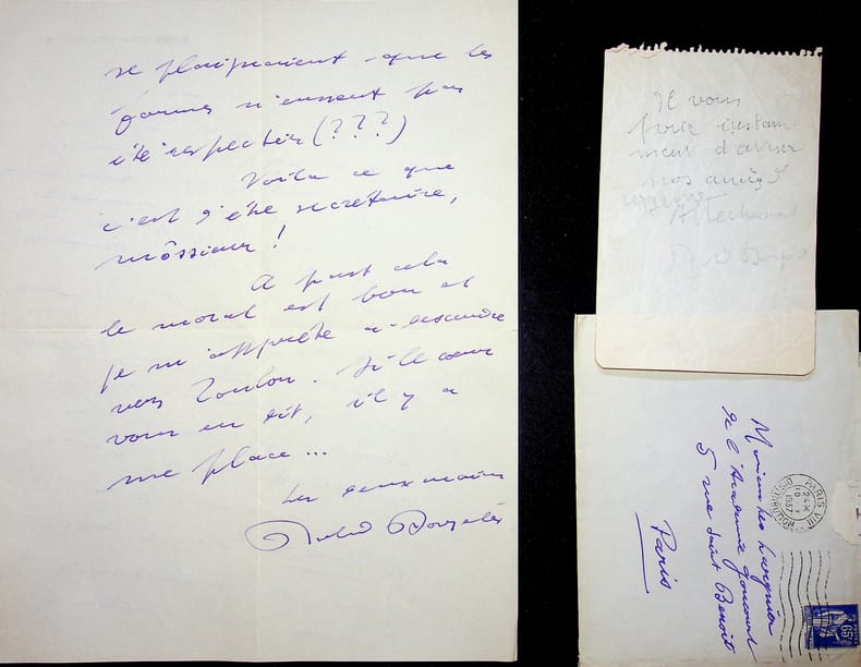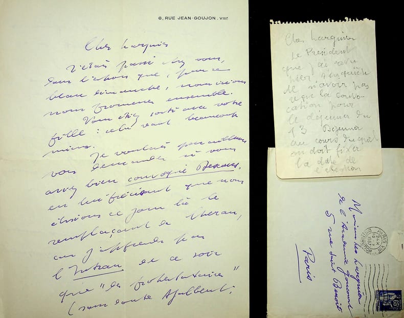Roland Dorgelès (1885-1973), écrivain, membre de l'Académie Goncourt. L.A.S. + enveloppe, 10 octobre 1937, 2p in-4. A l'écrivain membre de l'Académie Goncourt Léo Larguier (1878-1950). « Cher Larguier, J'étais passé chez vous, dans l'espoir que, par ce beau dimanche, nous irions nous promener ensemble. Vous étiez sorti avec votre fille : cela vaut beaucoup mieux. Je voulais par ailleurs vous demander si vous aviez bien convoqué Descaves, en lui précisant que nous élisons ce jour là le remplaçant de Chérau, car j'apprends par l'Intran[sigeant] de ce soir que les « protestataires » (sans doute Ajalbert) se plaignaient que les formes n'eussent pas été respectées (???). Voilà ce que c'est d'être secrétaire, môssieur ! A part cela, le moral est bon et je m'apprête à descendre vers Toulon. Si le coeur vous en dit, il y a une place. Les deux mains. Roland Dorgelès ». On joint un billet au crayon, probablement quelques jours plus tôt : « Cher Larguier, Le Président que j'ai revu hier s'inquiète de n'avoir pas reçu la convocation pour le déjeuner du 13. Déjeuner au cours duquel on doit fixer la date de l'élection. Il vous prie instamment d'aviser nos amis d'urgence. Affectueusement. Roland Dorgelès ». [447]