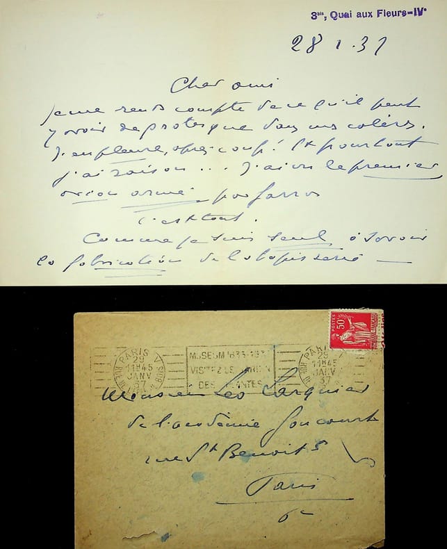René Benjamin (1885-1948), écrivain, journaliste, prix Goncourt 1915, membre de l'Académie Goncourt. L.A.S. + Enveloppe, Paris, 30 mai 1939, 2p in-8 A l'écrivain membre de l'Académie Goncourt Léo Larguier (1878-1950). « Mon cher ami, Voulez-vous être assez bon, avant que nous déjeunions demain ensemble, pour prendre connaissance du document ci-joint. C'est une lettre que Sacha Guitry a reçue du sieur Ajalbert. Elle lui a semblé d'une grande bassesse (vous savez qu'il n'a pas vu Ajalbert depuis vingt ans). Il m'a téléphoné tout de suite son dégoût, me disant qu'il ne répondrait pas, mais qu'il m'enverrait une copie, afin que je la montre à mes collègues. Je l'ai montrée hier à Daudet, après être passé rue St Benoit, où vous n'étiez pas. Daudet m'a dit : « il faut rire ! » mais il était attristé. J'ai téléphoné ce matin la lettre à Dorgelès, en supprimant bien entendu l'horrible allusion à sa femme et à Jean G. - mais il pouvait entendre tout le reste. Et la voici pour vous. Vous, mon cher ami, qui aimez la grandeur et avec des instincts princiers, je crois que souffrirez. A demain. Vous serez gentil de me rendre le document après le déjeuner : nous partirons ensemble. A vous de tout coeur. René Benjamin ». On joint la copie de la lettre d'Ajalbert, de la main de Léo Larguier (2p in-8). Jean G est Jean Guitry (1884-1920), acteur, frère ainé de Sacha. [443]