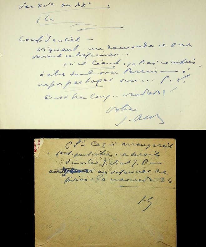 Jean Ajalbert (1863-1947), écrivain, membre de l'Académie Goncourt. L.A.S. + enveloppe, 28 janvier 1937, 2p in-8. A l'écrivain membre de l'Académie Goncourt Léo Larguier (1878-1950). « Cher ami, Je me rends compte de ce qu'il peut y avoir de grotesque dans mes colères. J'en pleure, après coup ! Et pourtant, j'ai raison. j'ai vu le premier avion armé par Garros. C'est tout. Comme je suis seul à savoir la fabrication de la tapisserie du XVe au XXe. Confidentiel. Vignaud me demande ce que devient le déjeuner où il tient, je l'ai compris, à être seul avec Perrin - à ne pas partager avec . G.L. [Georges Lecomte]. C'est bien long. vendredi. Votre. J. Ajal. [au dos de l'enveloppe] P.S. : ce qui arrangerait tout, peut-être, ce serait d'inviter J.V. [Jean Vignaud] et J.P. [Jean Perrin] au déjeuner de février, le mercredi 24. J.A. ». [448]