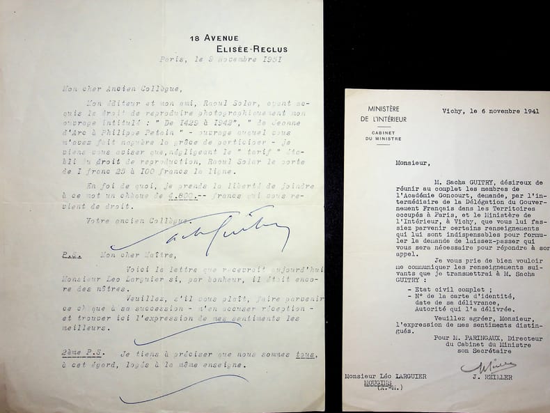 Sacha Guitry (1885-1957), écrivain, acteur, scénariste, réalisateur, membre de l'Académie Goncourt. L.S., Paris, 9 novembre 1951, 1p in-4. « Lettre posthume » à l'écrivain membre de l'Académie Goncourt Léo Larguier (1878-1950). Lettre que Guitry aurait adressée à Larguier, s'il était encore en vie, pour lui envoyer des ses droits d'auteurs. La lettre a été adressée à un « maître », probablement le notaire, afin qu'il fasse suivre le chèque. On joint une lettre à Larguier mentionnant Guitry en 1941. [449]