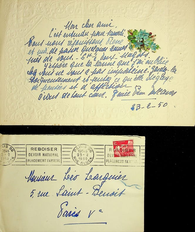 Renée Descaves (1899-1972), épouse de l'écrivain Pierre Descaves (1896-1966). L.A.S. + enveloppe, 23 février 1950, 1p in-8 oblong. A l'écrivain membre de l'Académie Goncourt Léo Larguier (1878-1950). Jolie lettre amicale pour accepter un dîner avec Larguier. [449]