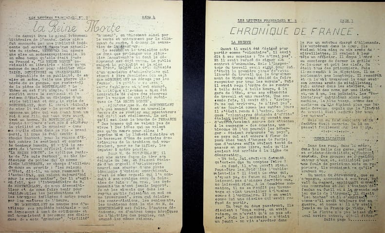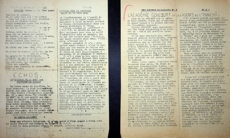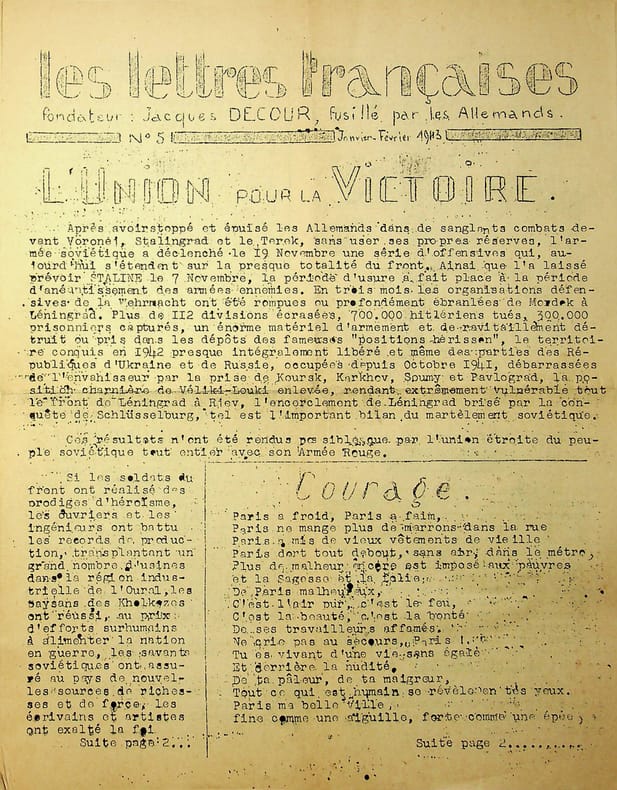 [Jacques Decour] Les Lettres françaises janvier-février 1943, n°5. 6p in-4, 1943. Rarissime exemplaire de ce journal clandestin, fondé par Jacques Decour. Ce numéro parle de l'Académie Goncourt et provient des archives de Léo Larguier, secrétaire de l'Académie. L'élection de Jean de La Varende avait été très mal vue par les résistants à l'époque. [449]