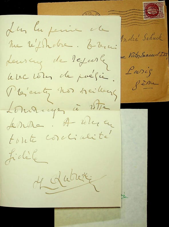 Philippe Chabaneix (1898-1982), poète. L.A.S. + dessin + enveloppe, 8 avril 1942, 2p in-8. Au bibliophile André Schück (1900-1985). Jolie lettre pour un rendez-vous. On joint un dessin de poupée, en couleurs et signé (probablement plus tardif). [449]