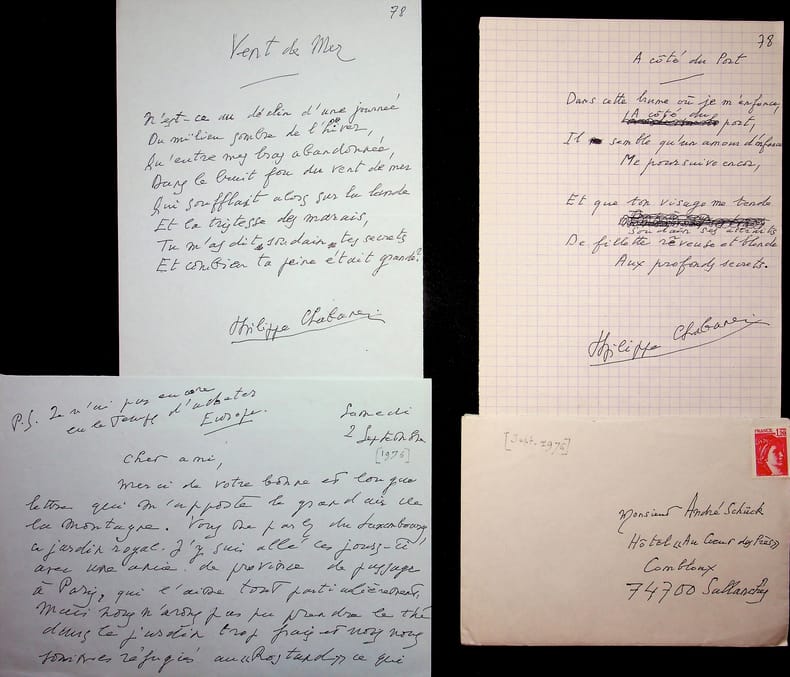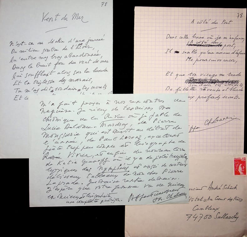 Philippe Chabaneix (1898-1982), poète. L.A.S. + 2 poèmes A.S + enveloppe, 2 septembre 1976, 4p in-8. Au bibliophile André Schück (1900-1985). Belle lettre amicale et mentionnant plusieurs poètes : Lucie Delarue Mardrus, Pierre Moussarie, Paul Lorenz, Renée Vivier, etc. Les deux poèmes sont « Vent de mer » (8 vers) et « A côté du port » (8 vers). [449]
