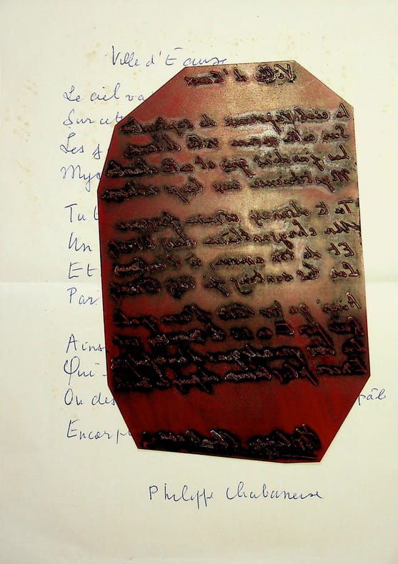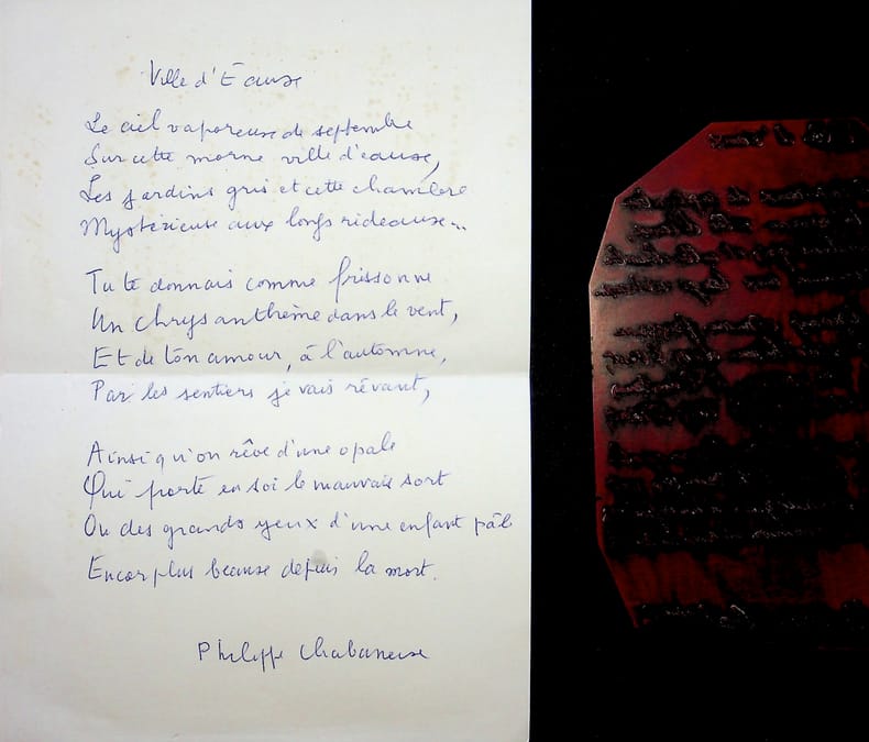 Philippe Chabaneix (1898-1982), poète. Poème A.S & plaque de gravure, sd, 1p in-8. Provenant du bibliophile André Schück (1900-1985). Poème « Ville d'Eaux », 12 vers, et sa reproduction en fac-simile (d'une autre copie autographe du même poème). Cette reproduction a probablement servi à une illustration d'un catalogue du libraire Pierre Lelant (à Angers). [449]