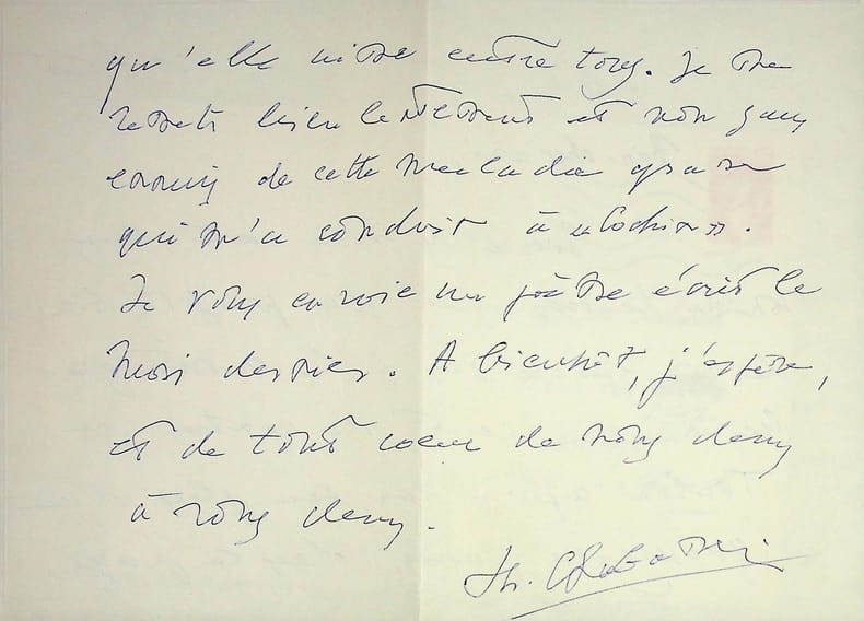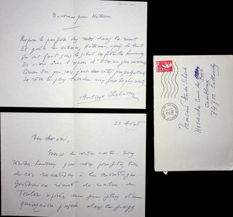 Philippe Chabaneix (1898-1982), poète. L.A.S. + Poème A.S. + enveloppe, 29 août 1981, 3p in-8 Au bibliophile André Schück (1900-1985). Jolie lettre amicale à laquelle a été joint un poème titré « Nocturne pour Hélène » (6 vers). [449]