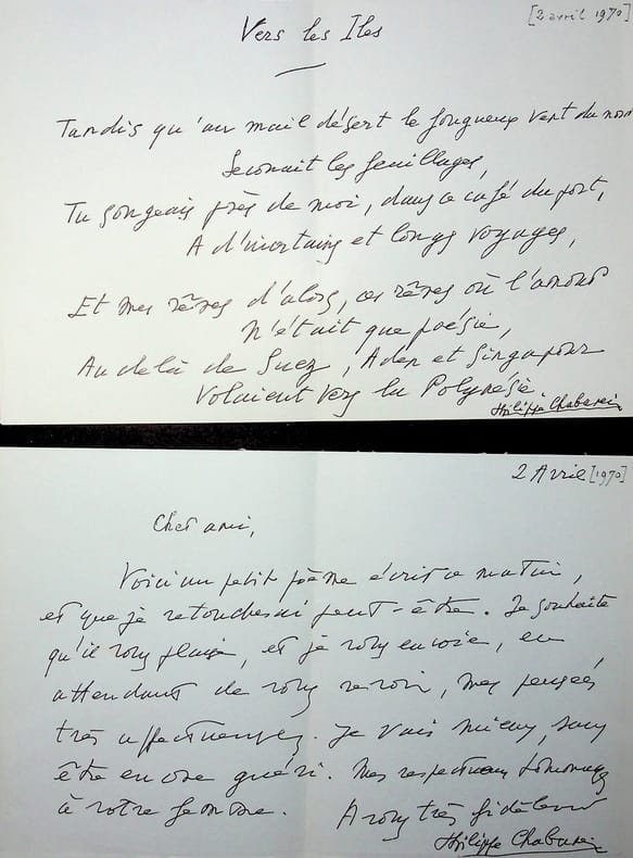 Philippe Chabaneix (1898-1982), poète. L.A.S. + Poème A.S., 2 avril 1970, 2P in-8. Au bibliophile André Schück (1900-1985). Petite lettre amicale à laquelle a été joint un poème titre « Vers les îles » (2 quatrains - 8 vers). [449]