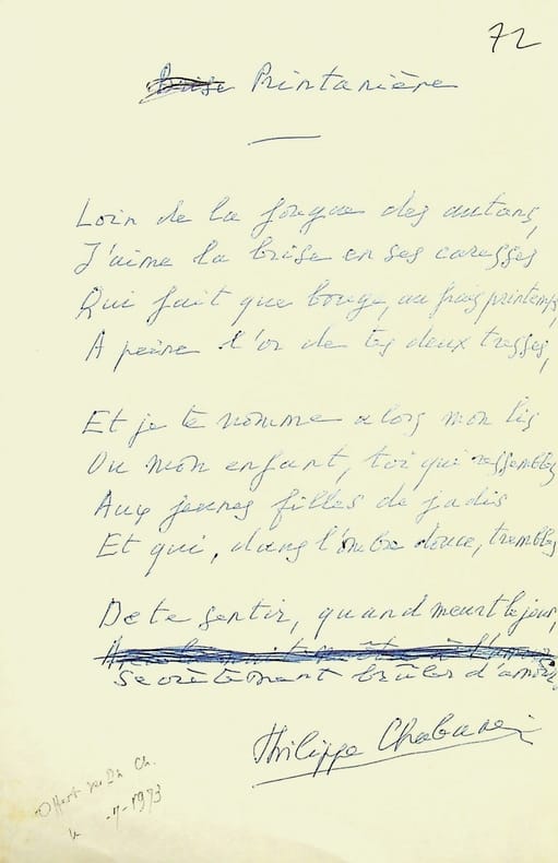 Philippe Chabaneix (1898-1982), poète. Poème A.S., [septembre 1973], 1p in-8. Poème de 10 vers titré « Brise Printanière » puis « Printanière ». Provenant du bibliophile André Schück (1900-1985). [450]