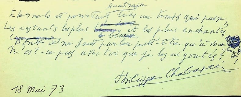 Philippe Chabaneix (1898-1982), poète. Poème A.S., 18 mai 1973, 1p in-12 oblong. Petit poème titré simplement « Quatrain » et commençant par « Eternels et pourtant liés au temps qui passe ». Provenant du bibliophile André Schück (1900-1985). [450]