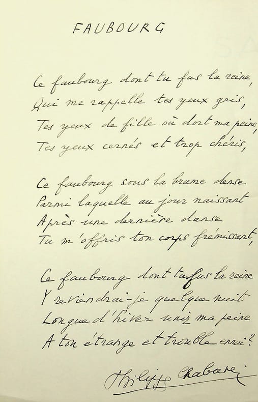 Philippe Chabaneix (1898-1982), poète. Poème A.S., sd, 1p in-8. Poème de 12 vers titré « Faubourg ». Provenant du bibliophile André Schück (1900-1985). [450]