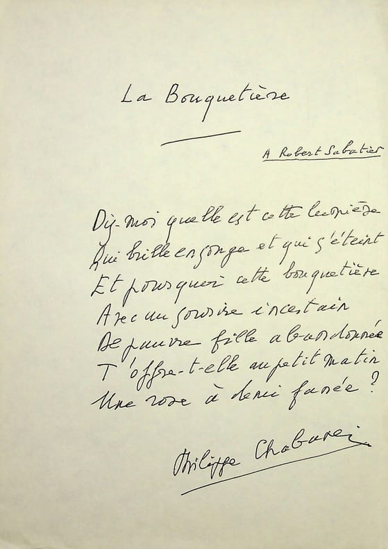 Philippe Chabaneix (1898-1982), poète. Poème A.S., sd, 1p in-8. Poème de 7 vers titré « La Bouquetière » et dédié à Robert Sabatier. Provenant du bibliophile André Schück (1900-1985). [450]