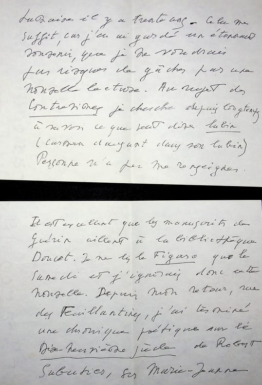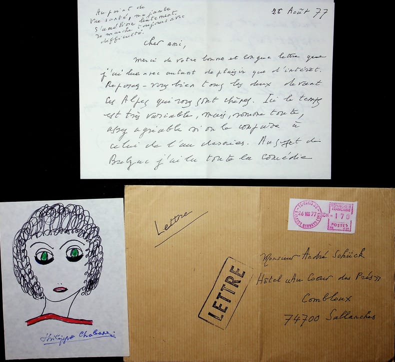 Philippe Chabaneix (1898-1982), poète. L.A.S. + dessin original signé, 26 août 1977, 4p in-8 & 1p in-12. Longue lettre amicale et littéraire à laquelle est joint un dessin d'une de ses poupées. Provenant du bibliophile André Schück (1900-1985). [450]