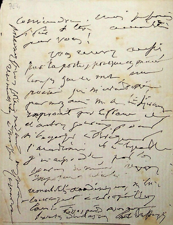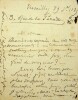 Emile Deschamps (1791-1871), poète. L.A.S., Versailles, 29 [janvier ?] 1869, 4p in-12. A la femme de lettres Eugénie Casanova (1825-1908), surnommée par Deschamps « la Muse du Berry ». « Madame, Comment vous remercier de vos remerciements ? Comment surtout ne pas vous en remercier mille fois, du fond de mon coeur ? Je [mots illisibles] par un mal : je suis au lit et plus souffrant, sans gravité toutefois, mais sans pitié. Pardonnez-moi toutes mes impatiences, Madame, mais du fond de mon lit, je ferai et je fais déjà tout le possible et tout [mots illisibles]. Combien je serais heureux d'[mots illisibles]. Aussi pour M. de Lamartine dont je connais l'amitié comme le génie. ». Lettre très difficile à déchiffrer. [393]
