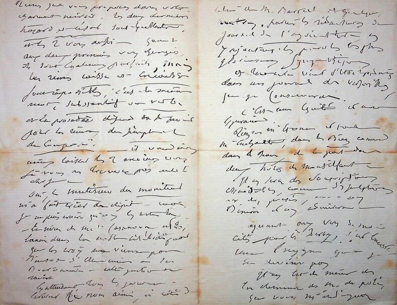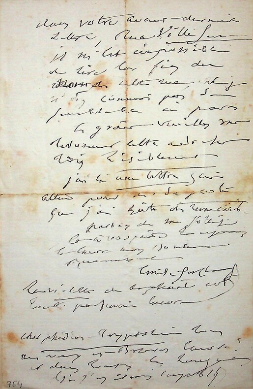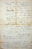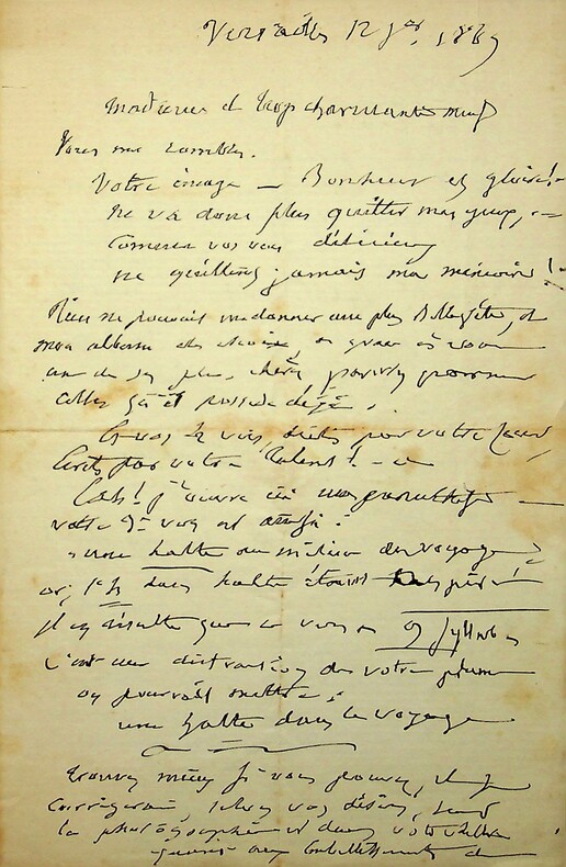 Emile Deschamps (1791-1871), poète. L.A.S., Versailles, 29 [janvier ?] 1869, 4p in-12. A la femme de lettres Eugénie Casanova (1825-1908), surnommée par Deschamps « la Muse du Berry ». « Madame, Comment vous remercier de vos remerciements ? Comment surtout ne pas vous en remercier mille fois, du fond de mon coeur ? Je [mots illisibles] par un mal : je suis au lit et plus souffrant, sans gravité toutefois, mais sans pitié. Pardonnez-moi toutes mes impatiences, Madame, mais du fond de mon lit, je ferai et je fais déjà tout le possible et tout [mots illisibles]. Combien je serais heureux d'[mots illisibles]. Aussi pour M. de Lamartine dont je connais l'amitié comme le génie. ». Lettre très difficile à déchiffrer. [393]