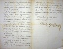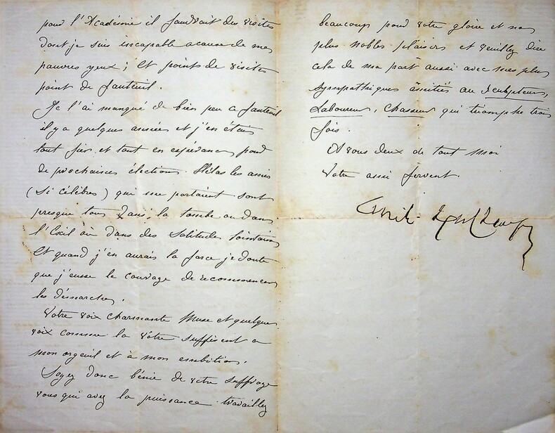 Emile Deschamps (1791-1871), poète. L.S., Versailles, 6 février 1869, 2p 1/2 in-8. A la femme de lettres Eugénie Casanova (1825-1908), surnommée par Deschamps « la Muse du Berry ». Belle lettre au moment du remplacement de Pierre-Antoine Berryer à l'Académie française. « Je ne puis faire aucune démarche pour l'Académie, il faudrait des visites dont je suis incapable à cause de mes pauvres yeux ; et point de visites, point de fauteuil. Je l'ai manqué de bien peu ce fauteuil, il y a quelques années, et j'en étais tout fier et tout en espérance pour de prochaines élections. Hélas les amis (si célèbres) qui me portraient sont presque tous dans la tombe ou dans l'Exil ou dans ses solitudes lointaines et quand j'en aurais la force, je doute que j'eusse le courage de recommencer les démarches ». [393]