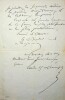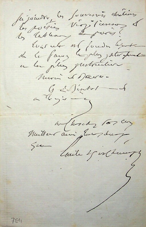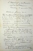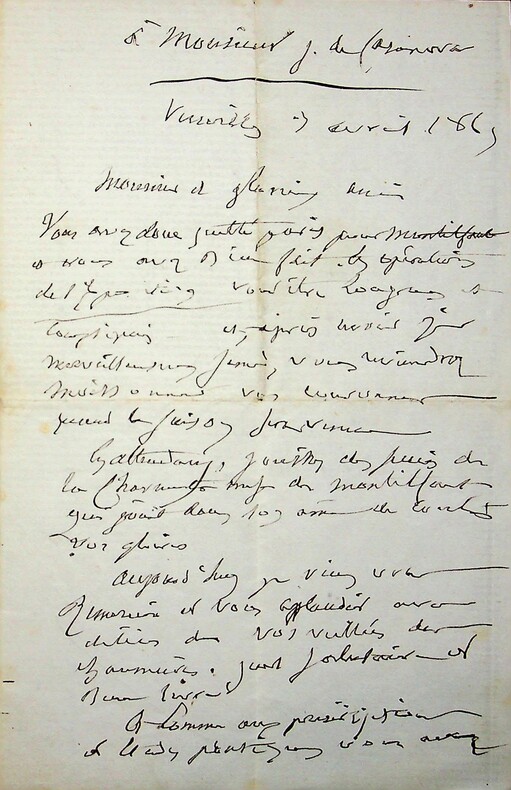 Emile Deschamps (1791-1871), poète. L.A.S., Versailles, 3 avril 1869, 2p in-8. Au sculpteur et agronome Antonio Josué Casanova (1831-1877), époux d'Eugénie Casanova (1825-1908), surnommée par Deschamps « la Muse du Berry ». « Monsieur et glorieux ami, Vous avez donc quitté Paris pour Montifaut et vous avez bien fait. Les opération de l'Exposition vont être longues et compliquées. Et après avoir [mot illisible] merveilleuses [mot illisible], vous reviendrez moissonner vos couronnes quand la saison sera venue. En attendant, jouissez des [mot illisible] de la charmante muse de Montifaut [.]. Aujourd'hui, je viens vous remémorer [?] et vous applaudit avec délice de vos veillées des chaumières. ». Belle lettre amicale. [393]