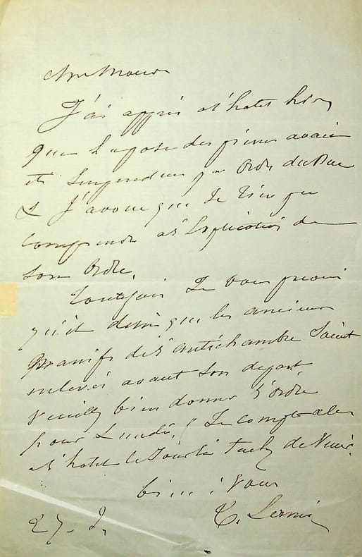 1894 Deux pages et demie sur un feuillet double (129 X 140 mm) de papier vergé bleuté, rédigées à l'encre noire.