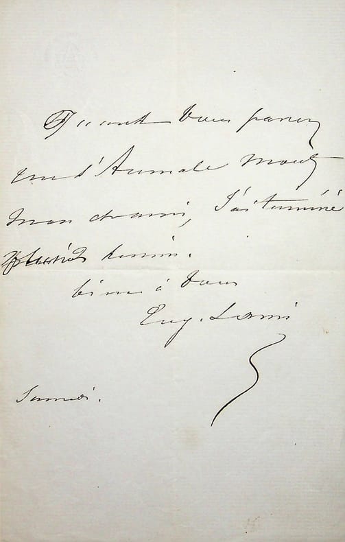 Eugène Lami (1800-1890), peintre, costumier, décorateur. L.A.S., sd [samedi], 1p in-8. « Quand vous passez rue d'Aumale [mots illisibles], j'ai terminé plusieurs dessins. Bien à vous. Eug. Lami ». [451]