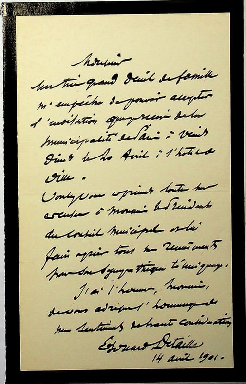 Edouard Detaille (1848-1912), peintre. L.A.S., 14 avril 1901, 1p in-8. « Monsieur, Un très grand deuil de famille m'empêche de pouvoir accepter l'invitation que je reçois de la municipalité de Paris à venir diner le 20 avril à l'hôtel de ville. Voulez-vous exprimer toute mes excuses à monsieur le Président du conseil municipal et lui faire agréer tous mes remerciements pour son sympathique témoignage. J'ai l'honneur, Monsieur, de vous adresser l'hommage de mes sentiments de haute considération. Edouard Detaille ». [451]