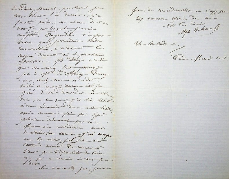 Alphonse de Neuville (1835-1885), peintre, illustrateur. L.A.S., sd [mercredi soir], 2p 1/2 in-8. Belle lettre du peintre qui ne sait si son tableau va être vendu à un ministère et dont la famille « irritée » contre lui, lui a « retiré ses ressources ». Il a aussi eu moins d'argent du Paris Journal à cause de son absence. Il lui demande son aide auprès de Frédéric Bourgeois de Mercey (1803-1860) afin de réussir à vendre son tableau. Mercey, peintre, était chef de bureau au Ministère de l'Intérieur. Belle lettre, peu commun. [451]