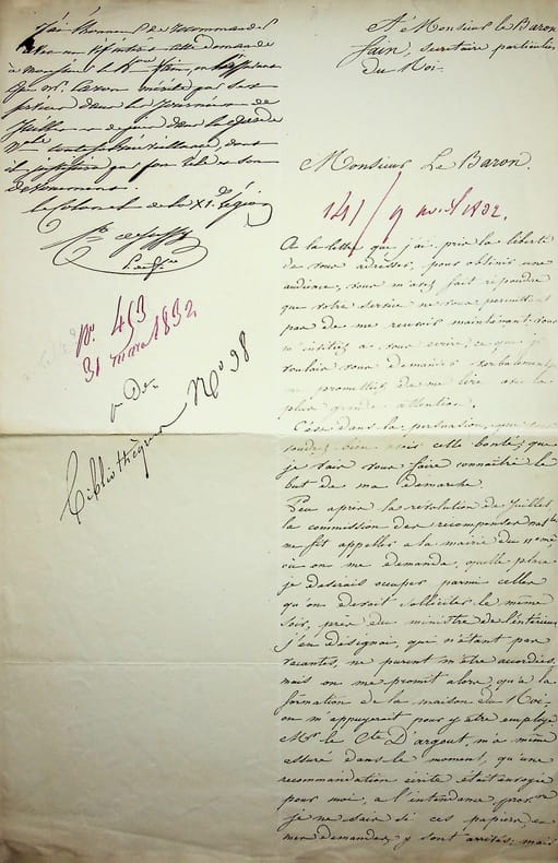 Alexandre-Charles Caron (XIXe) ? Adolphe-Alexandre-Joseph Caron (1797-1867) ?, « artiste graveur d'histoire, décoré de la Croix de Juillet » ; Jean-Baptiste Collin de Sussy (1776-1837), homme politique, militaire. L.A.S., 29 mars 1832, 2p in-4. Au baron Agathon Fain (1778-1836). Longue lettre afin d'obtenir une place. L'auteur de ce courrier n'est pas clairement identifié. Dans la liste des récipiendaires de la Croix de Juillet, on trouve un seul Caron, Alexandre-Charles Caron, mais il nous semble lire « J Caron » comme signature. Le document porte une recommandation du comte de Sussy, colonel de la Xie Légion, pair de France. [451]
