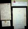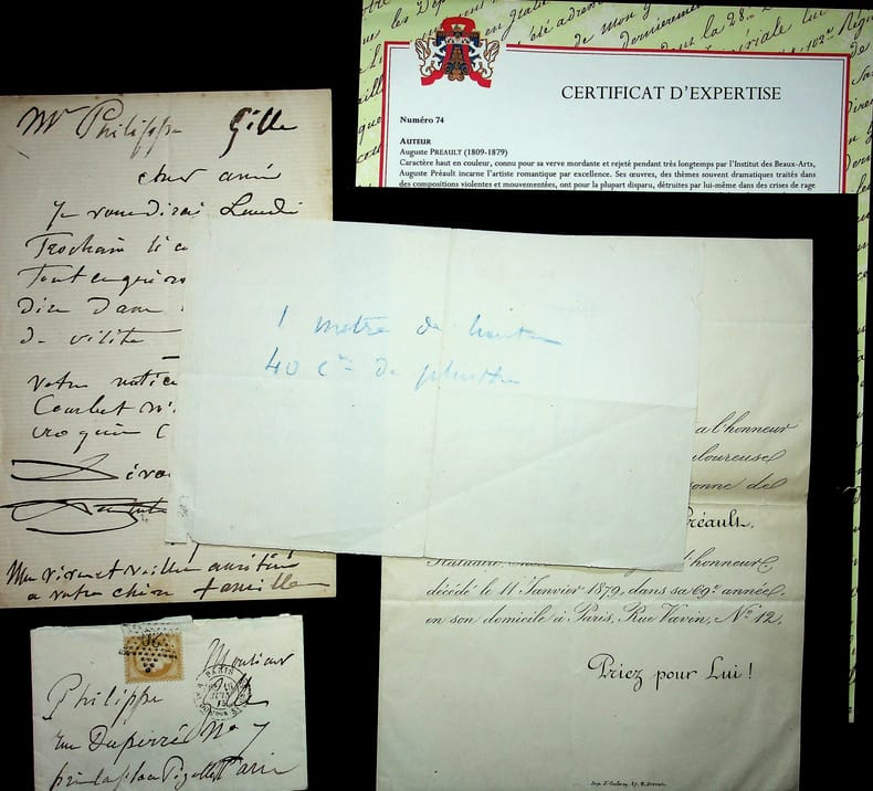 Auguste Préault (1809-1879), sculpteur, médailleur, figure majeure du romantisme. L.A.S. + dessin + enveloppe, 1er janvier 1878, 1p in-8. A l'écrivain Philippe Gille (1830-1901). « Cher ami, Je vous dirai lundi prochain si cela est possible. Tout ce qui ne peut se dire dans cette carte de visite si banale. Votre notice Gustave Courbet n'est pas un croquis c'est une Camée. Dévouement. Auguste Préault. Ma vive et vieille amitié à votre chère famille ». On joint une enveloppe autographe au même, datée de juin 1875. On joint un croquis d'une sculpture, au crayon bleu, signé A.P., avec au dos la mention « 1 mètre de hauteur, 40cm de plinthe ». Petite note à l'encre, d'une autre main, « Preault 1875 ». Il s'agit de la statue de Jacques Coeur. Les dimensions indiquées au dos sont différentes de celles de la statue conservée à Bourges. On joint le faire-part de décès de Préault. On joint un certificat d'expertise, signé. Très bel ensemble. [451]