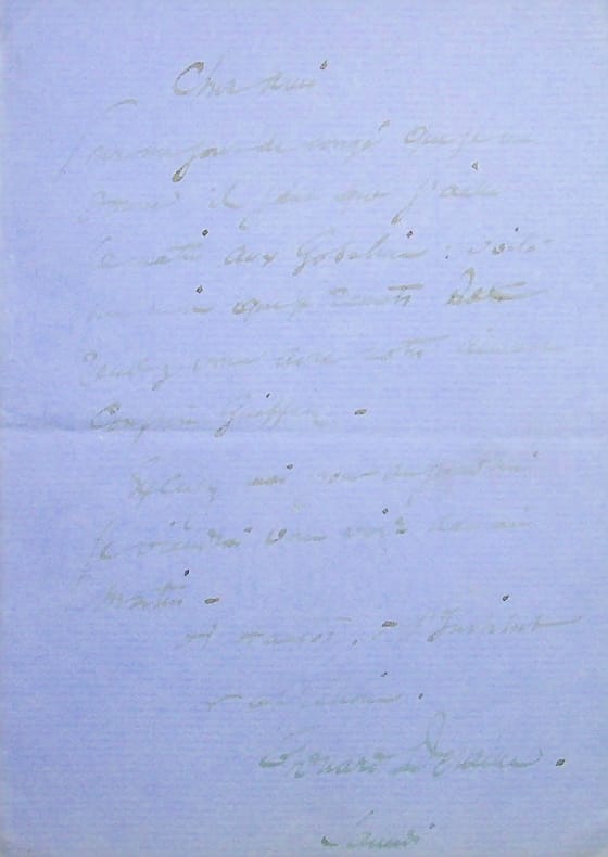Edouard Detaille (1848-1912), peintre. L.A.S., sd, 1p in-8. « Cher ami, Pour un jour de congé que je me donne, il faut que j'aille aux Gobelins : voilà [partie illisible] du rendez-vous avec notre confrère [Walter] Griffin. Excusez-moi pour aujourd'hui, je viendrai vous voir demain matin. A bientôt à l'institut. Votre affectionné Edouard Detaille ». Encre éclaircie. [451]