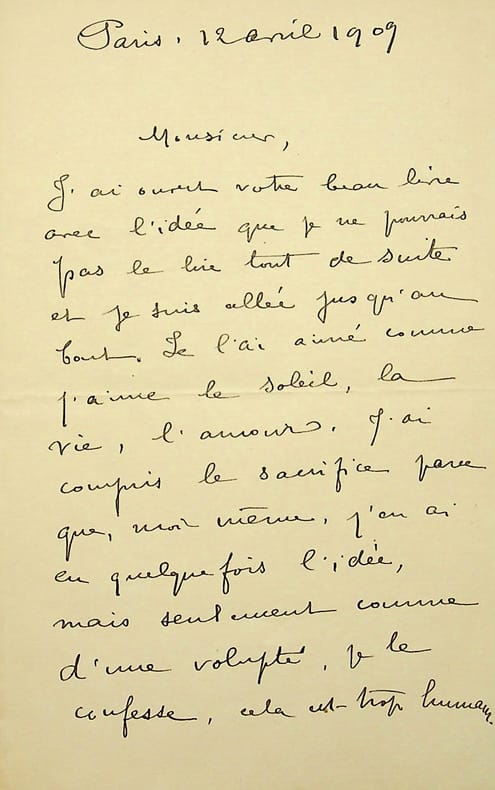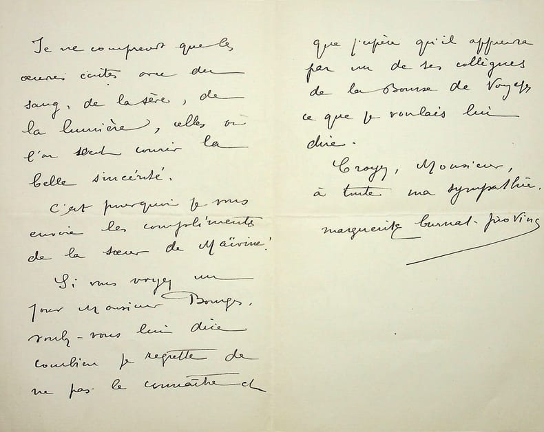 Marguerite Burnat-Provins (1872-1952), peintre, écrivain. L.A.S., Paris, 12 avril 1909, 2p 1/2 in-8. Au poète et écrivain Lucien Rolmer (1880-1916). Très belle lettre sur son livre Maïvine, publié en 1909, précisant : « je ne comprends que les oeuvres écrites avec du sang, de la sève, de la lumière, celles où l'on sent courir la belle sincérité ». Belle lettre. [451]