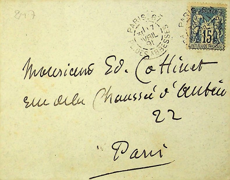 Pierre Puvis de Chavannes (1824-1898), peintre. Enveloppe autographe signée, 7 avril 1891. Enveloppe seule, sans la correspondance, adressée à l'écrivain Edmond Cottinet (1824-1895). Signée au dos [451]
