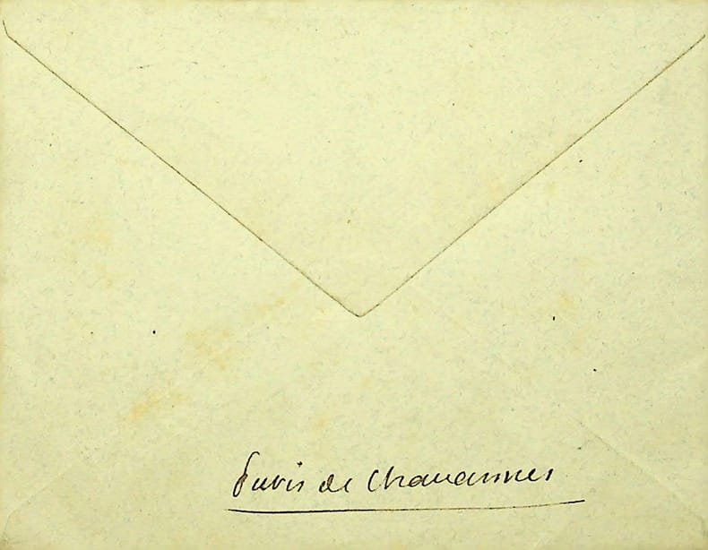 Lettre à quatre mains, rédigée en partie par Colette et en partie par son époux Henri de Jouvenel. Elle est adressée à Marguerite Moreno Chez les Zoaques. Il s’agit de la demeure de Sacha Guitry et de Charlotte Lysès.Elle évoque un séjour prochain dans sa propriété de Rozven, acquise par Missy en 1910 et que cette dernière lui laissa lors de leur rupture : « Tu vois, j’ai déménagé, les Boudet [ ?], qui habitent comme tu sais rue Cortambert, te prient à dîner jeudi 10 ( ?) parce que je vais à Rozven. »La lettre est signée Collerette. La partie rédigée par Henri de Jouvenel est un curieux poème bachique dont nous n’avons trouvé aucune occurrence : « Démone aux almes cheveux vieux sourire au haut gout de l’acajou vineux qu’habite un démiurge incertain. Ex quel vins ! Je suis la Grèce et toi l’Épire qu’attends-tu pour nous réunire (sic) ? … vieux vampire circoncire L’ennui royal et dur dont le dard noir me point. Je voudrais bien mettre quelque chose pour Sacha mais quand il saura que je ressemble à la momie de Ramsès II ça ne lui fera plus plaisir. »Quelques gouttes ont taché l’enveloppe. Reste d’onglet en marge.