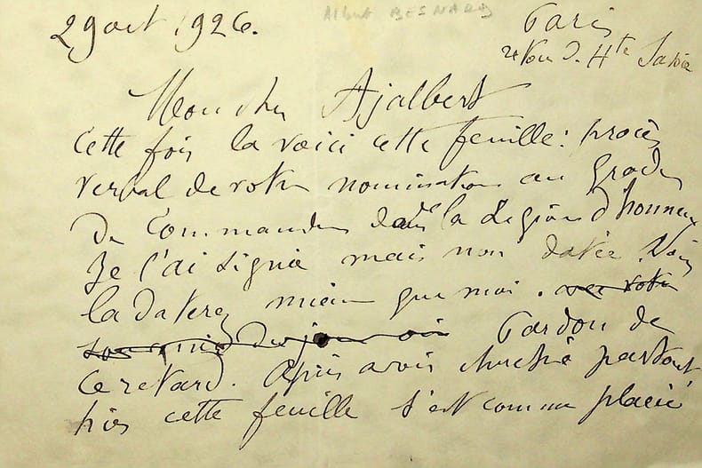 Albert Besnard (1849-1934), peintre, graveur, grand prix de Rome 1874. L.A.S., 29 octobre 1926, 2p in-8. A l'écrivain Jean Ajalbert (1863-1947). Belle lettre à laquelle était joint le « procès-verbal de réception d'un commandeur de la Légion d'Honneur ». Besnard l'a rempli et signé mais non daté. Il laisse Ajalbert le signer et le dater. Ce document est conservé dans le dossier d'Ajalbert à la Légion d'Honneur (côte 19800035/371/49870, image 3). On remarquera que le document a été anti-daté (8 mai 1926) et que le dossier aussi son procès-verbal de réception d'officier, signé par Mistral, et celui de chevalier, signé par Gustave Geffroy. Joli document. [452]