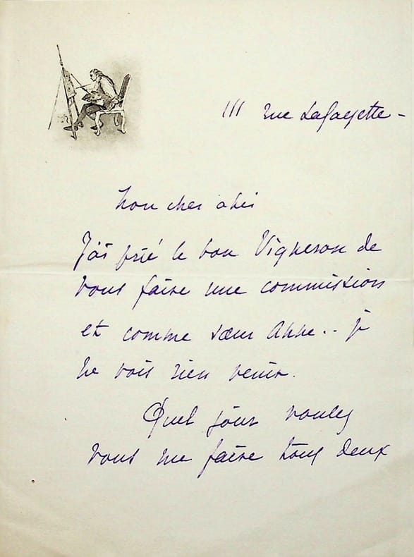 Georges Cain (1853-1919), écrivain, peintre. L.A.S.,sd, 3p in-12. « Mon cher ami, J'ai prié le bon Vigneron de vous faire une commission et comme soeur Anne. je ne vois rien venir. Quel jour voulez-vous me faire tous deux le grand plaisir de venir à l'atelier. Ma femme sera heureuse de vous recevoir. Henri, Back et moi boirons à votre santé, et au souvenir du cher papa que vous aimiez et qui vous le rendait bien. Réponse bien vite et à vous de sincère et reconnaissante amitié. Georges Cain ». [452]