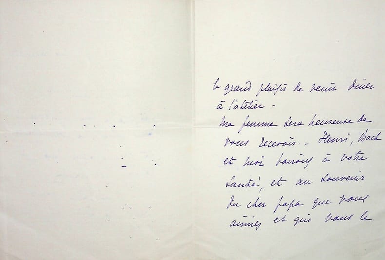 Pensée et courrier adressés à Léon Lang.Léon Lang, fondateur de la Société Godefroy Engelmann à Mulhouse, a demandé à divers artistes une pensée personnelle signée sur lart et un portrait de lartiste en vue dune exposition. Nous vous proposons ici cette pensée accompagnée d'une lettre autographe de 2 feuillets écrits au recto uniquement, reproduction d'un portrait de l'artiste en photographie jointe.