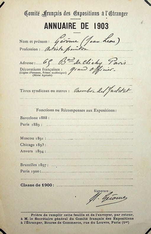 [Comité français des expositions à l'étranger] Jean-Léon Gérôme (1824-1904), peintre, sculpteur, graveur. P.A.S., sd [1903], 1P in-8. Feuillet pour faire partie de l'annuaire du comité pour 1903. [452]