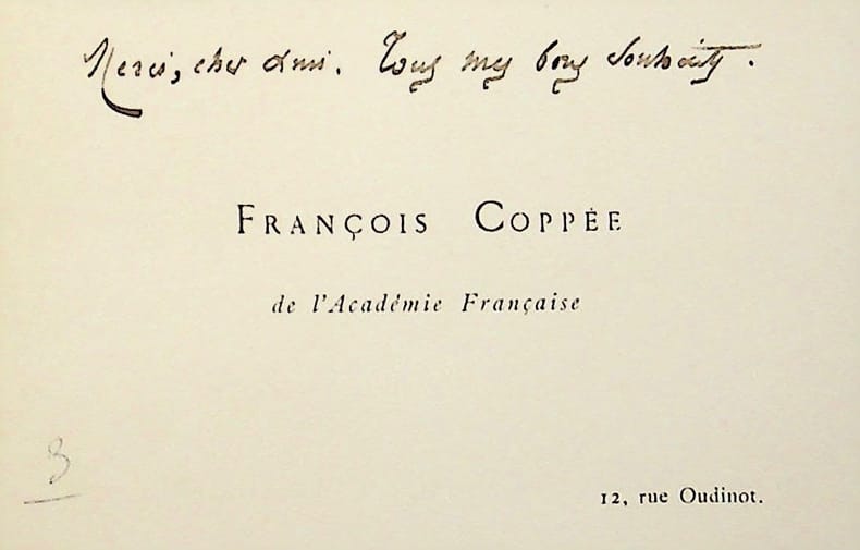 François Coppée (1841-1908), poète, écrivain. C.A., sd, 1 ligne. « Merci, cher ami. Tous mes bons souhaits ». [452]