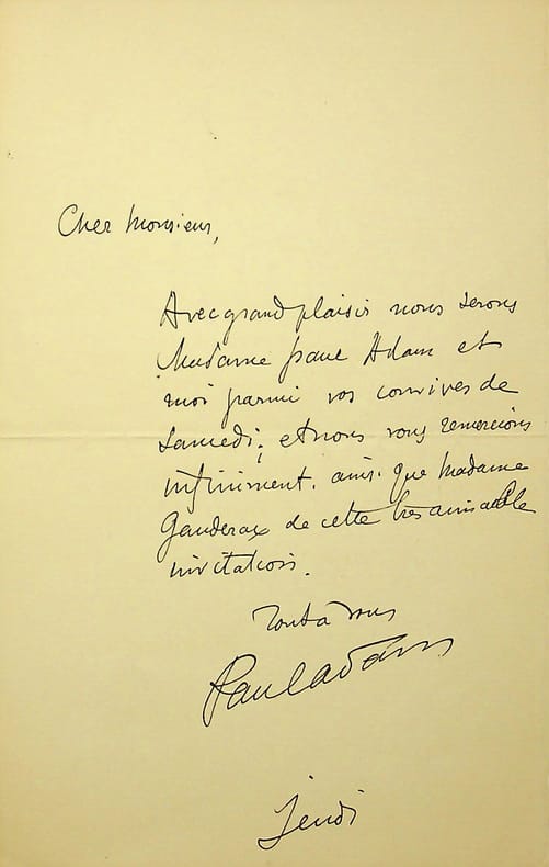 Paul Adam (1862-1920), écrivain. L.A.S., sd, 1p in-8. Au journaliste L Gauderax (actif au journal La Plume). Il accepte une invitation. [453]