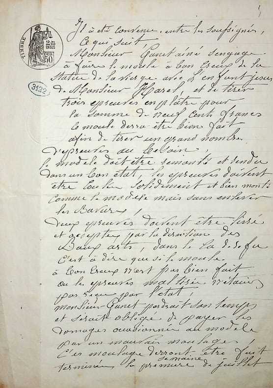 Amand Harel (1836-1885), sculpteur. P.S., 29 avril 1875, 2p in-4. Beau contrat entre Harel et un fondeur, Ganet ainé, afin de faire un moule et tirer trois épreuves en plâtre de sa « statue de la Vierge avec l'enfant Jésus ». Harel devra le payer dès que l'état l'aura payé. Un exemplaire de cette statue est conservée en l'église Saint Léonard de Fougères. [453]