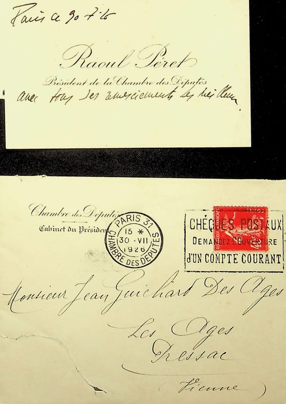 Raoul Péret (1870-1942), avocat, gomme politique, président de la Chambre des députés. C.A., 30 juillet 1926, 1 ligne. « Avec tous ses remerciements », probablement après des félicitations pour sa nomination comme président de la Chambre. On joint l'enveloppe, de la main d'un secrétaire. Document adressé à Jean Guichard des Ages à Pressac. [136]