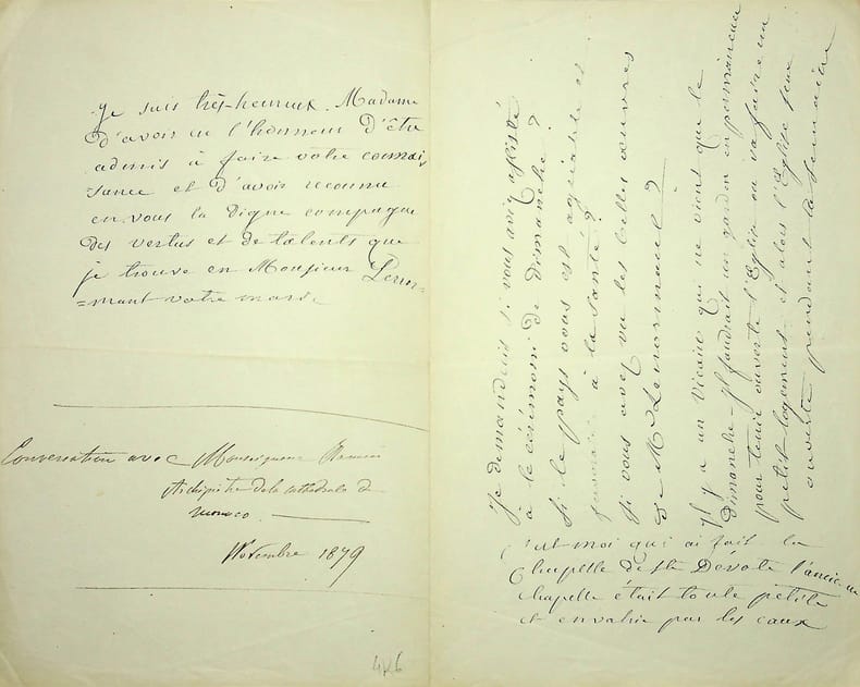 [Monaco, chapelle de Saint Dévote] Joseph-Antoine Ramin (ca.1835-1899), prêtre, curé de Saint Nicolas de Monaco, archiprêtre. L.A., novembre 1879, 1p 1/2 in-8. Lettre à madame « Lenormant » i.e. Uranie de Lavit (1812-1883), épouse de l'architecte Louis Lenormand. L'auteur de la lettre, archiprêtre de la cathédrale de Monaco, dit être à l'origine de la nouvelle chapelle de Sainte Dévote à Monaco, très importante pour Monaco (inaugurée en 1871). Sympathique document. [148]