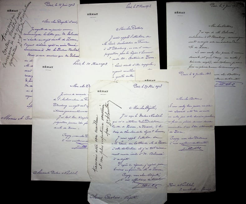 [Antoine de Zwan / Antoni Zwan, écrivain polonais] Justin de Selves (1848-1934), homme politique, ministre, président du Sénat. 6 L.S., 1913, 6p in-8. Au docteur Natchel, d'origine polonaise, sauf une au débuté Adrien Constans qui l'a fait suivre à Natchel. Au sujet de démarches pour faire obtenir la Légion d'Honneur à Zwan. Il ne semble pas l'avoir reçu (absent de la base Léonore). [148]