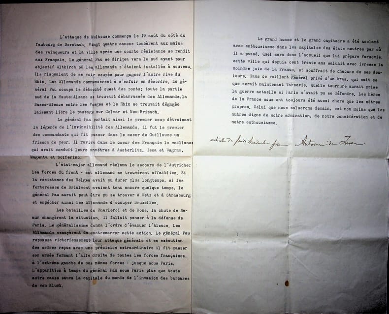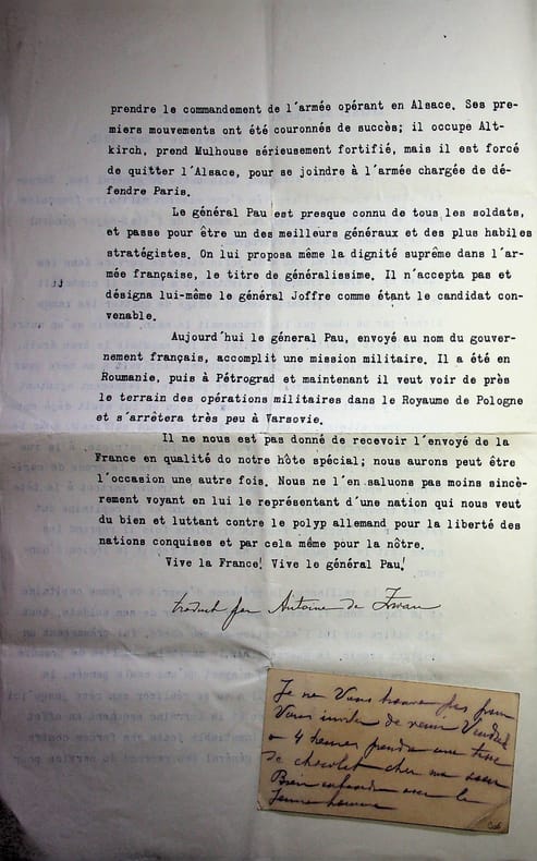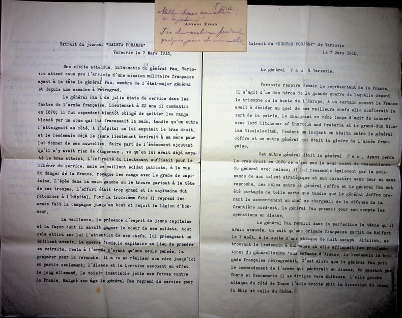 Antoine de Zwan / Antoni Zwan (XIXe-XXe), écrivain polonais. C.A. & 2 tapuscrits signés, 1915-1927. Carte (datée d'une autre main 5 octobre 1927) : « Mille choses aimables de la part d'[Antoni Zwan]. J'ai été malade pendant quelques jours et même alité. Je ne vous trouve pas pour vous inviter de venir vendredi à 4 heures pendre une tasse de chocolat chez ma soeur. Bien entendu avec le jeune homme ». Les deux tapuscrits sont des extraits des journaux polonais relatant la visite du général Paul Pau (1848-1932) à Varsovie et traduits par Zwan qui signe ses traductions. Ce sont des extraits de Gazeta Poranna et Kuryer Poranny du 7 mars 1915. [148]