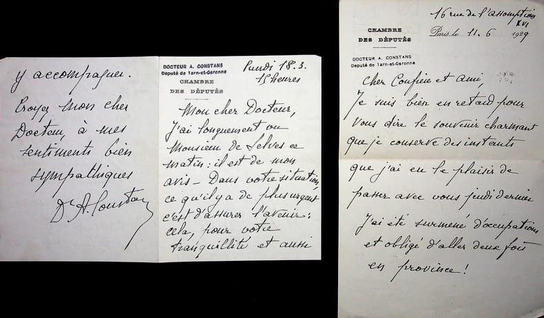 Adrien Constans (1873-1932), homme politique, député. 2 L.A.S., 18 mars & 11 juin 1929, 6p in-12/in-8. Au docteur Nachtel Lettres amicales et mentionnant une affaire pour laquelle Natchel doit voir un notaire. [148]