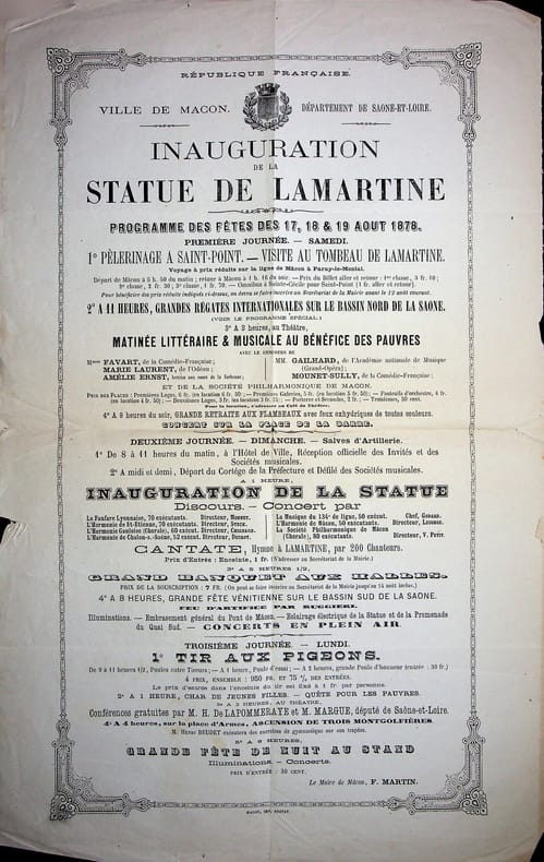 [Alphonse de Lamartine] Affiche de l'Inauguration de la statue de Lamartine à Maçon en 1878. Macon, imprimerie Protat, 1878. Environ 395*250mm. Beau document avec le détail des festivités qui ont duré trois jours, du 17 au 19 août 1878. Plis anciens, petites déchirures. Rare document. [148]