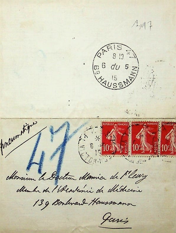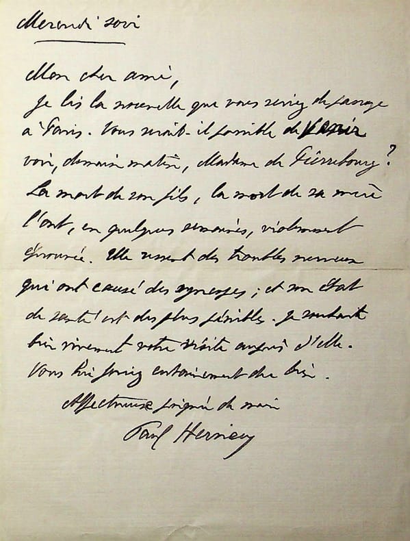 Paul Hervieu (1857-1915), écrivain, membre de l'Académie française. L.A.S., 6 mai 1915, 1p in-12. Au docteur et écrivain Maurice de Fleury (1860-1931). Sachant Fleury à Paris, il lui demande de visiter madame de Pierrebourg, « violemment éprouvée » par la mort de son fils et de sa mère. Il s'agit de Marguerite de Pierrebourg (1856-1943), femmes de lettres sous le pseudonyme de Claude Ferval et maitresse de Paul Hervieu. Ils sont d'ailleurs enterrés ensemble au cimetière de Passy. Elle a en effet perdu son fils le 3 janvier 1915 et sa maman le 23 mars 1915. Elle perdra son amant peu de temps après, le 25 octobre 1915. [454]