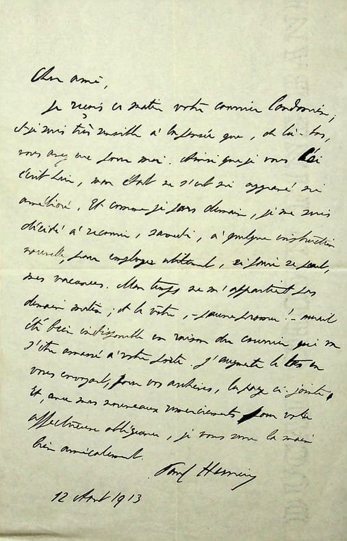 Paul Hervieu (1857-1915), écrivain, membre de l'Académie française. L.A.S., 12 août 1913, 1p in-8. Au docteur et écrivain Maurice de Fleury (1860-1931). Jolie lettre amicale donnant des nouvelles de sa santé. [454]