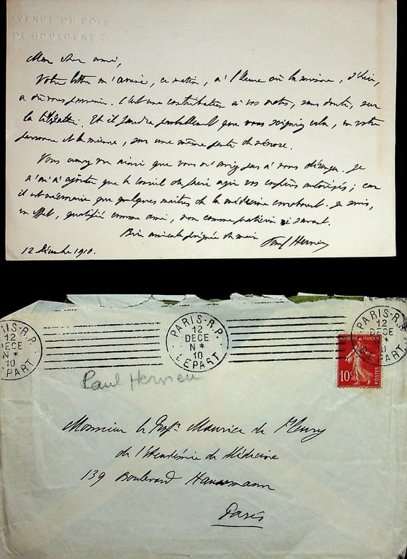 Paul Hervieu (1857-1915), écrivain, membre de l'Académie française. L.A.S. + enveloppe, 12 décembre 1910, 1p in-8. Au docteur et écrivain Maurice de Fleury (1860-1931). Petite lettre amicale. [454]
