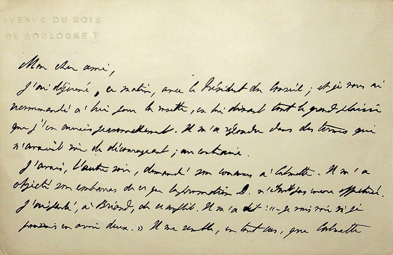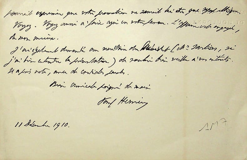 Paul Hervieu (1857-1915), écrivain, membre de l'Académie française. L.A.S., 11 décembre 1910, 2p in-8. Au docteur et écrivain Maurice de Fleury (1860-1931). Il a déjeuné avec le président du Conseil, Aristide Briand, à qui il a recommandé Fleury pour la Légion d'Honneur. « L'affaire est engagée ». Toutefois, il faudra attendre 1913 pour que Fleury l'obtienne réellement. [454]