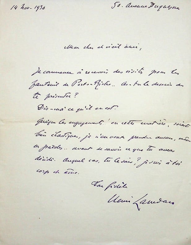Henri Lavedan (1859-1940), écrivain, journaliste, membre de l'Académie française. L.A.S., 14 novembre 1939, 1p in-8. Au docteur et écrivain Maurice de Fleury (1860-1931). Jolie lettre : « Je commence à recevoir des visites pour le fauteuil de Porto Riche. As-tu le dessin de te présenter ? Dis-moi ce qu'il en est. Quoique les engagements en cette matière soient bien élastiques, je n'en veux prendre aucun, même en paroles. avant de savoir ce que tu auras décidé. Auquel ca, tu le sais ? Je suis à toi corps et âme ». Fleury s'était déjà présenté. Il eut même 9 voix en 1927 face à Louis Madelin. [454]