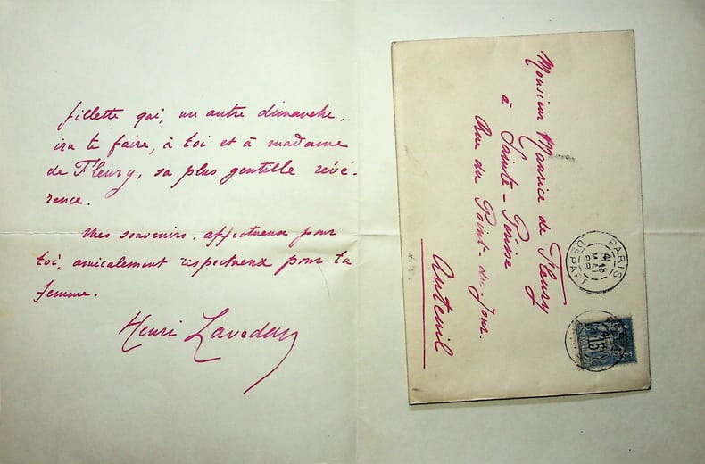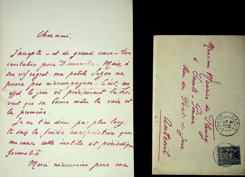 Henri Lavedan (1859-1940), écrivain, journaliste, membre de l'Académie française. L.A.S. + enveloppe, 4 mai 1888, 2p in-8. Au docteur et écrivain Maurice de Fleury (1860-1931). Belle lettre amicale pour accepter une invitation le dimanche mais sans sa fille Suzon qui sera avec sa maman. Lavedan et son épouse étaient déjà séparés (ils divorceront en 1890). Belle lettre plus calligraphiée qu'à son habitude et à l'encre rouge. [454]